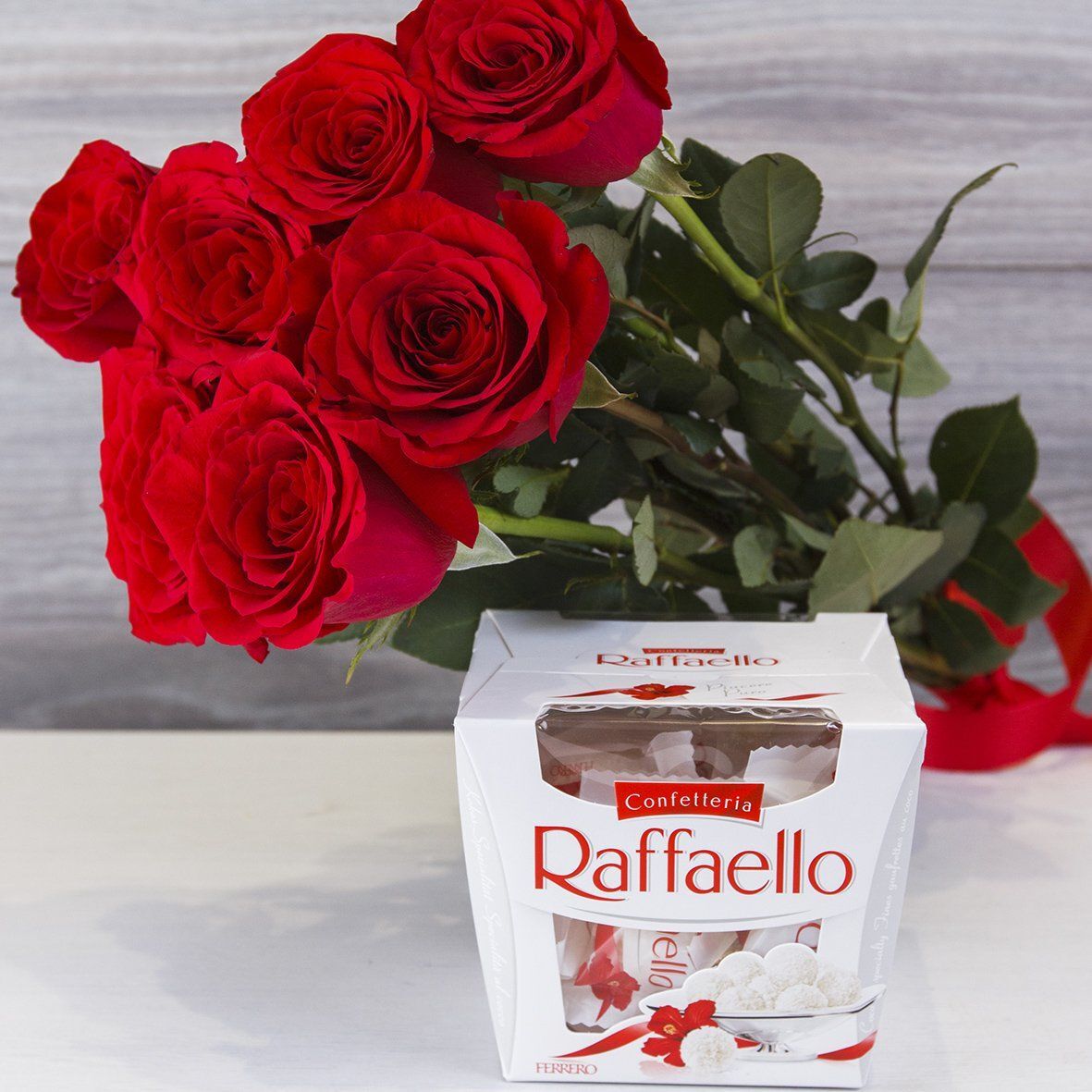 Нежный и страстный букет из 7 красных роз сорта Эксплорер, перевязанный атласной лентой, дополнен утончённой коробочкой конфет Raffaello.