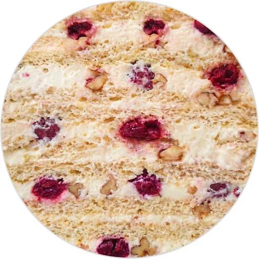 Тонкие нежные коржи на сгущенном молоке, сливочный крем, вишня и грецкие орехи.