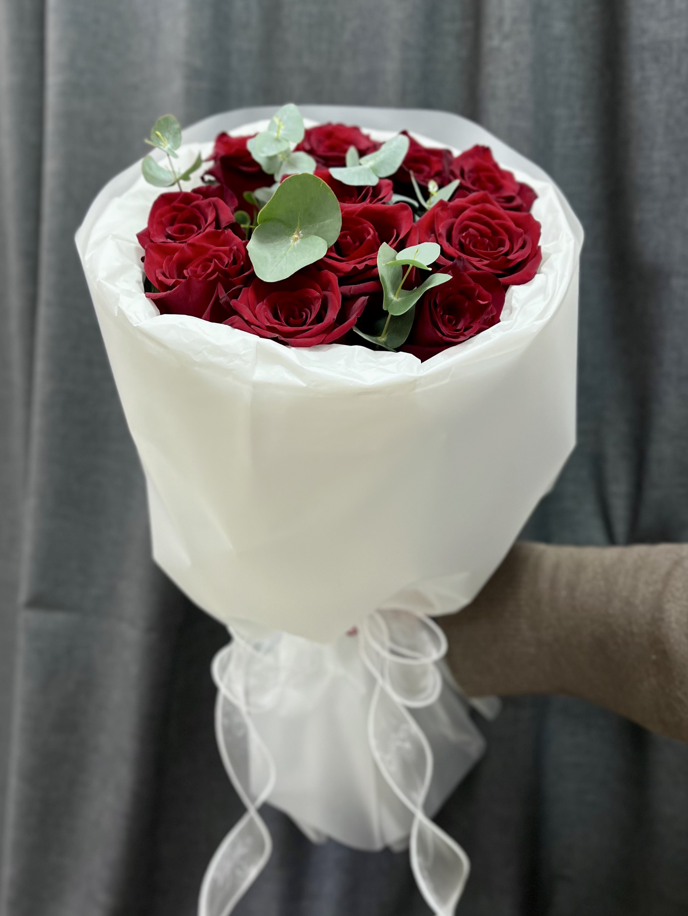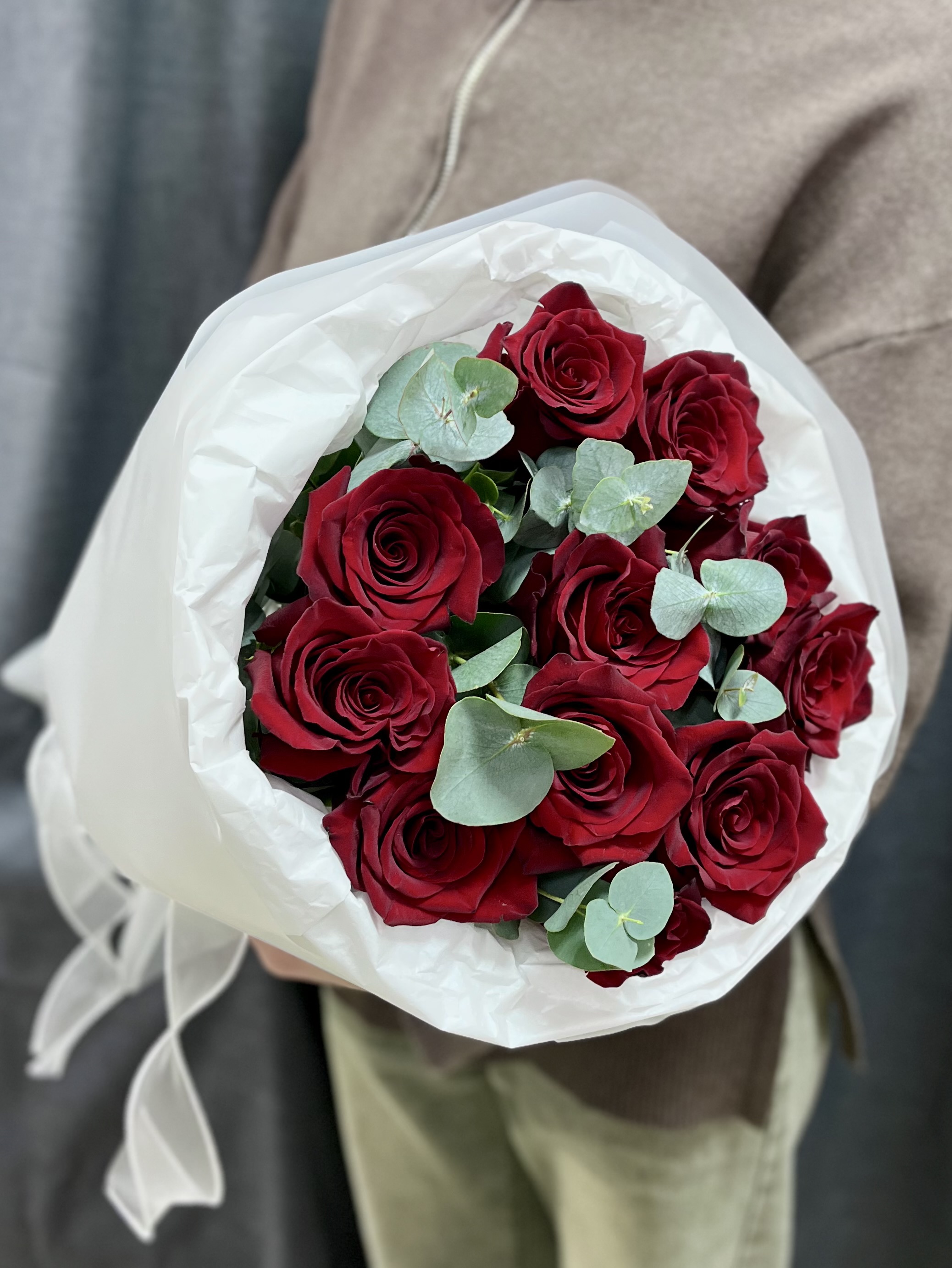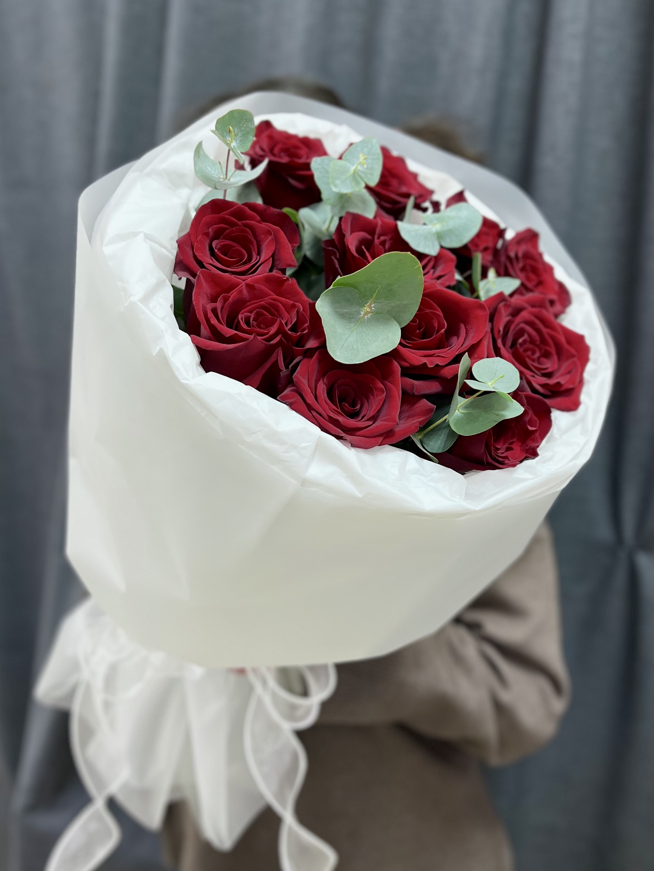 Прекрасное сочетание в букете насыщенных красных роз сорта Эксплорер и свежих веточек эвкалипта, оформленных в светлую нежную упаковку.