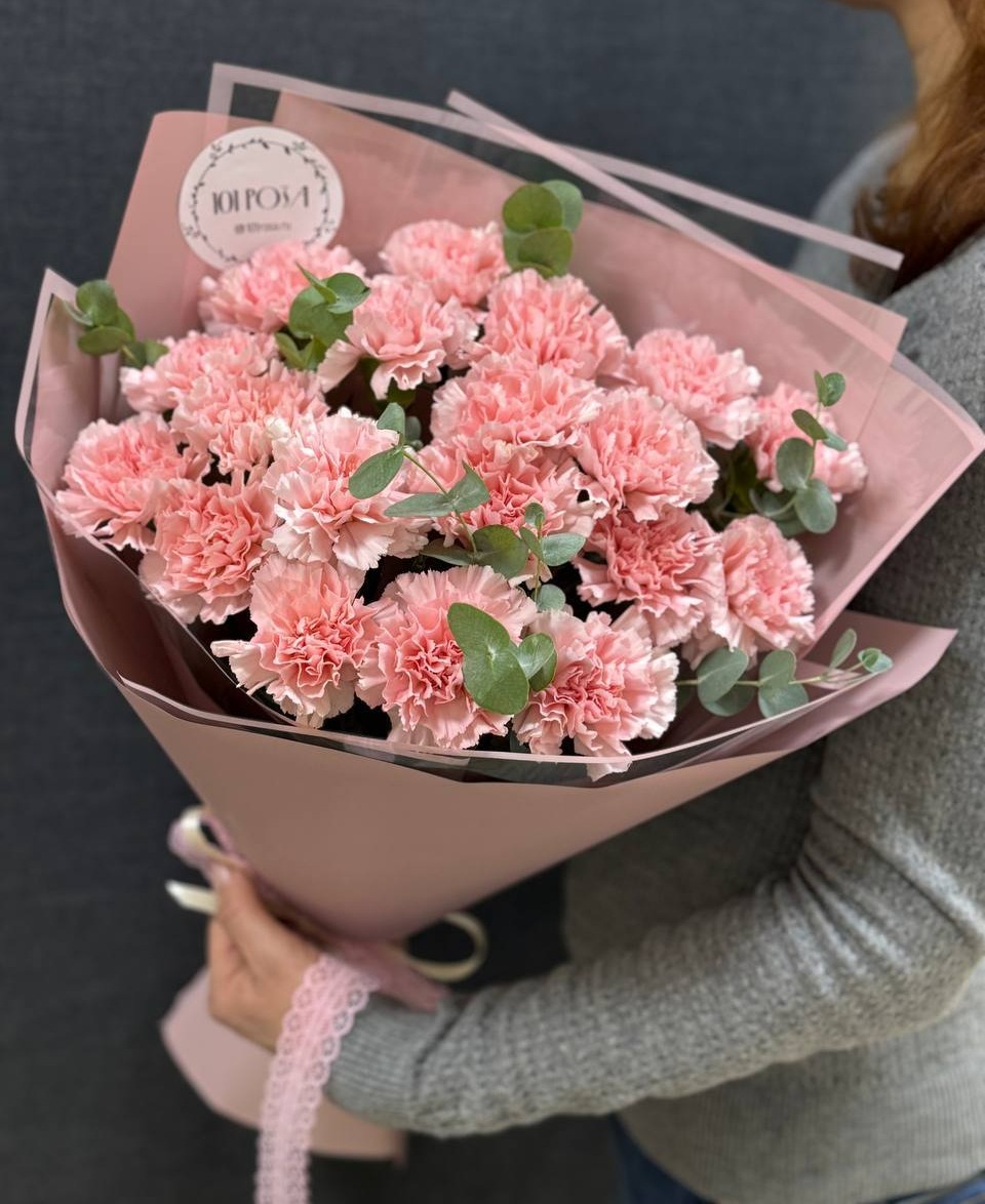 Нежность в каждом лепестке — пыльно-розовые и яркие розовые диантусы в объятиях свежего эвкалипта.