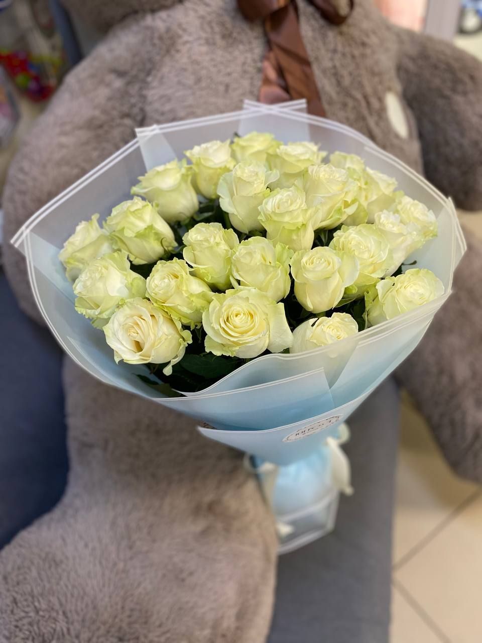 Лёгкий и нежный, как утренний туман, букет из 25 белых роз сорта Мондиаль. Их чистота подчёркнута небесно-голубой упаковкой, словно ласковое небо обнимает эти цветы!