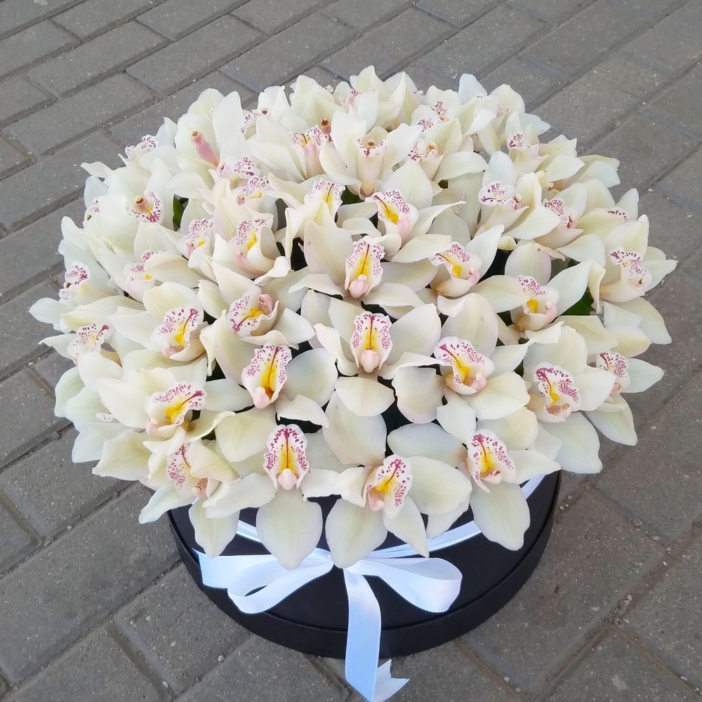 Изысканная композиция, где белоснежные орхидеи словно парят в пространстве элегантной черной коробки. Это произведение флористического искусства воплощает в себе гармонию контрастов и утонченную роскошь.