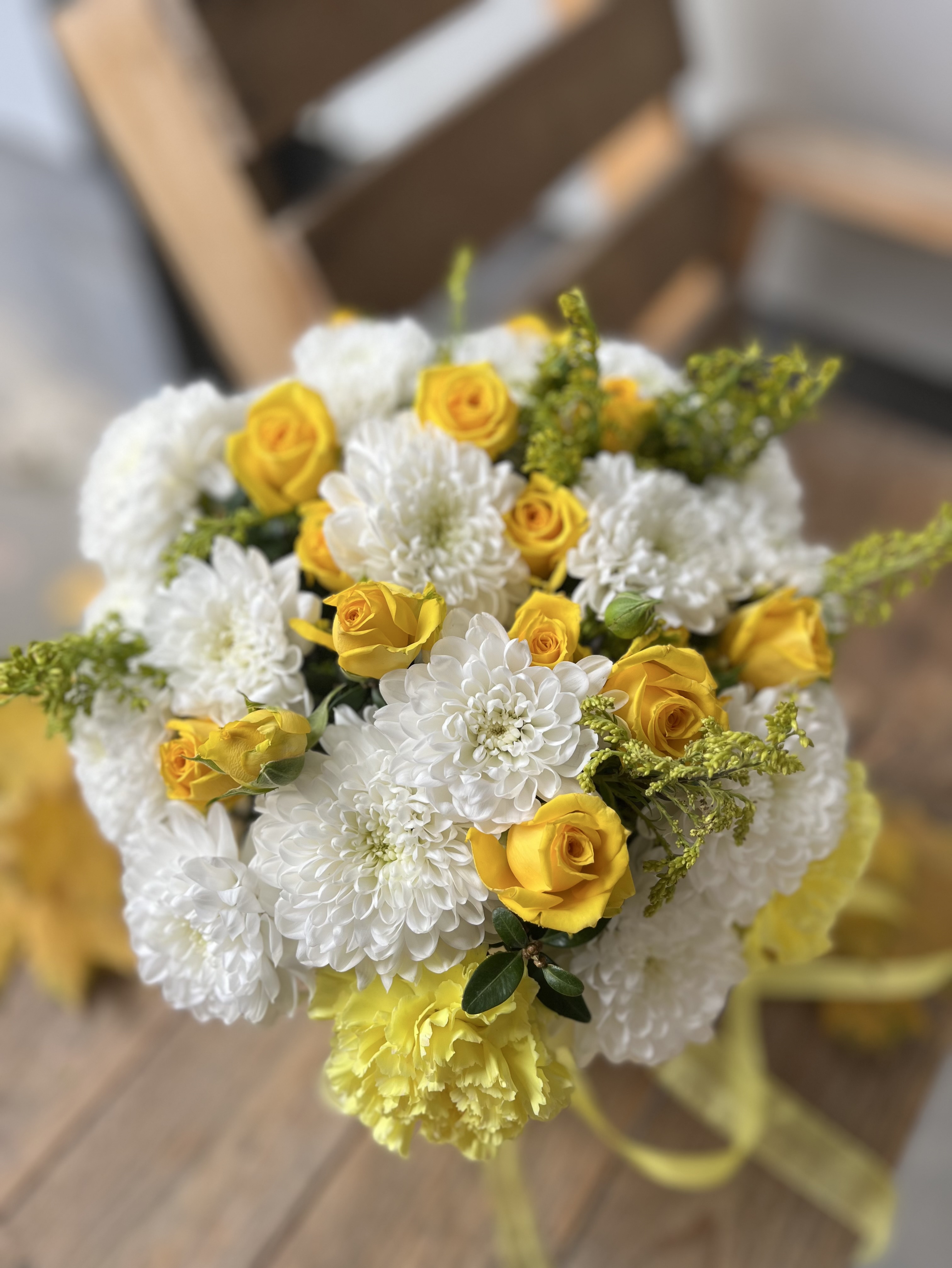 Композиция с кустовыми розами, диантусами и белоснежной хризантемой, дополненная веточками зелени
